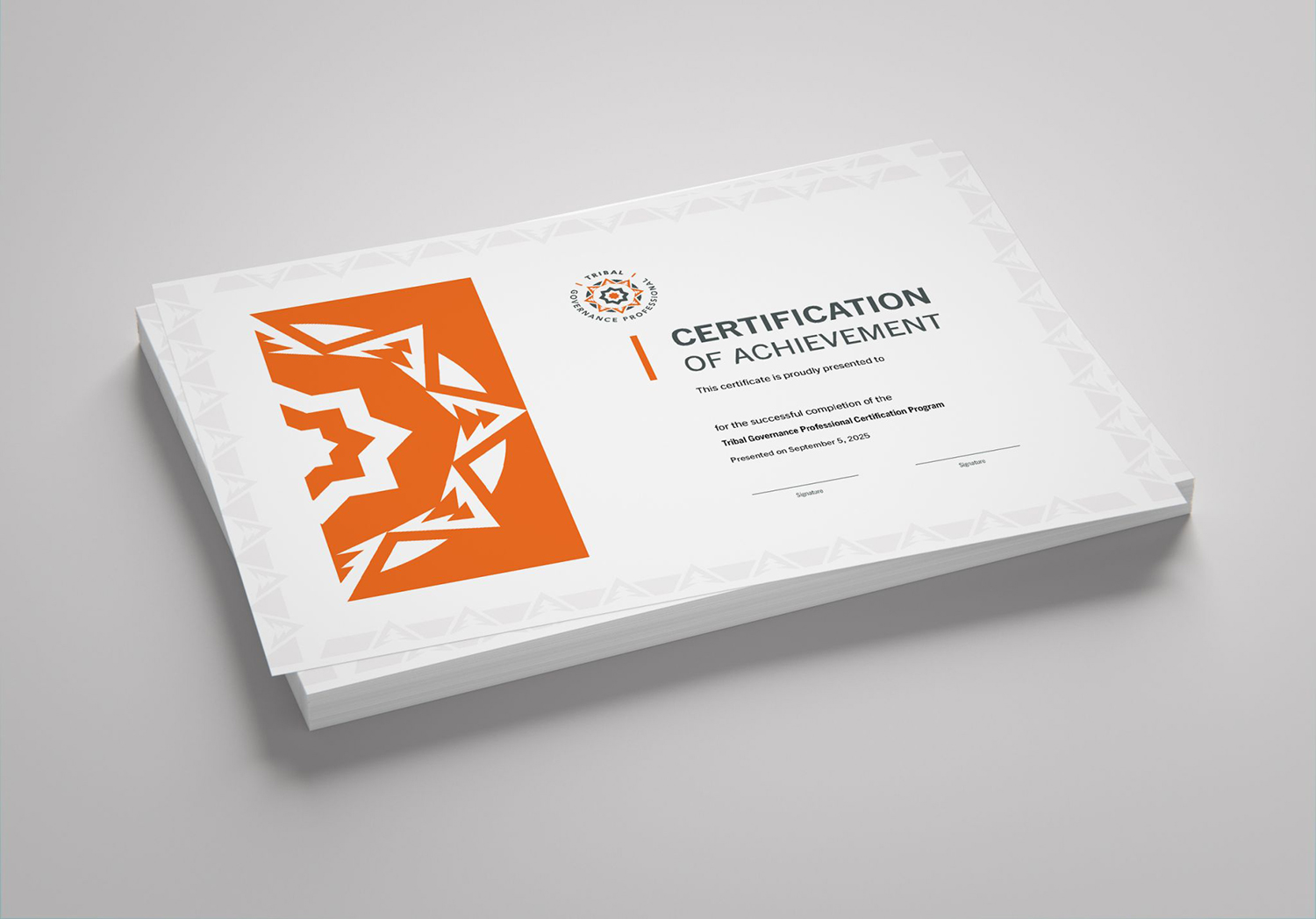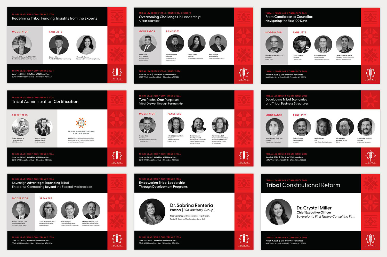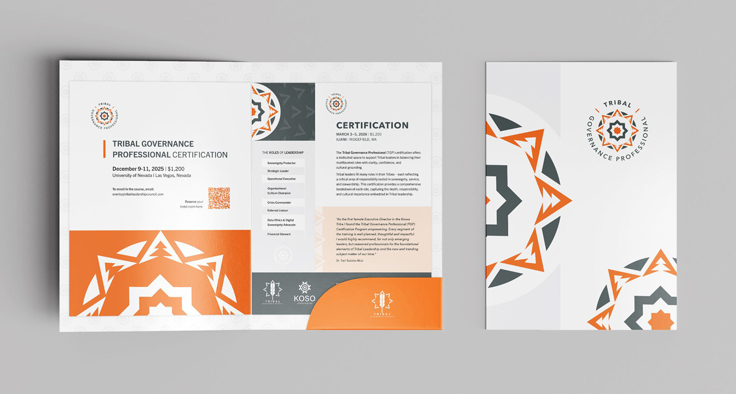 Tran Creative is working with Tribal Leadership Council to create all-new brand assets for the organization: conference speaker/session graphics, annual report, certificates, flyers, slide deck, presentation folder, and a new logo and brand identity for Tribal Governance Professional (TGP).